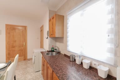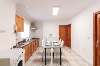 Fully equipped kitchen and dining area, washing machine, coffee maker, kettle, fridge, toaster.