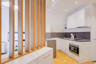 The studio features a comfortable sleeping area, a bright living space and a fully equipped kitchen, all thoughtfully designed within a modern open-plan layout.