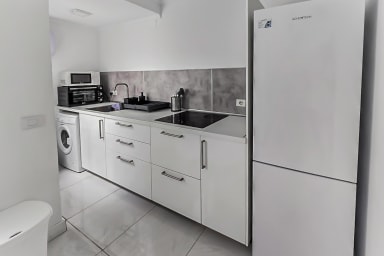 Fully equipped kitchen and dining area TO SHARE, with washing machine, coffee maker, fridge and microwave.