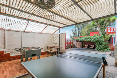 Large pool area with barbecue, solarium, sun beds, covered area, outdoor shower and bathroom.