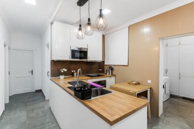 Fully equipped kitchen and dining area TO SHARE, with washing machine, coffee maker, fridge and oven.